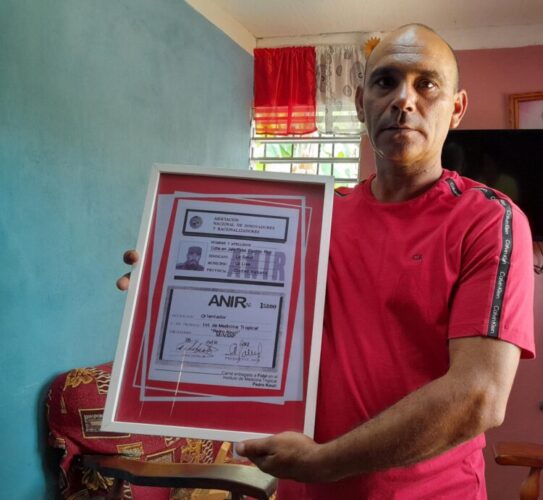 Yanier guarda orgulloso un cuadro con la reproducción del carné de anirista del Comandante en Jefe Fidel Castro Ruz, el Innovador Mayor. | foto: Lianne Fonseca