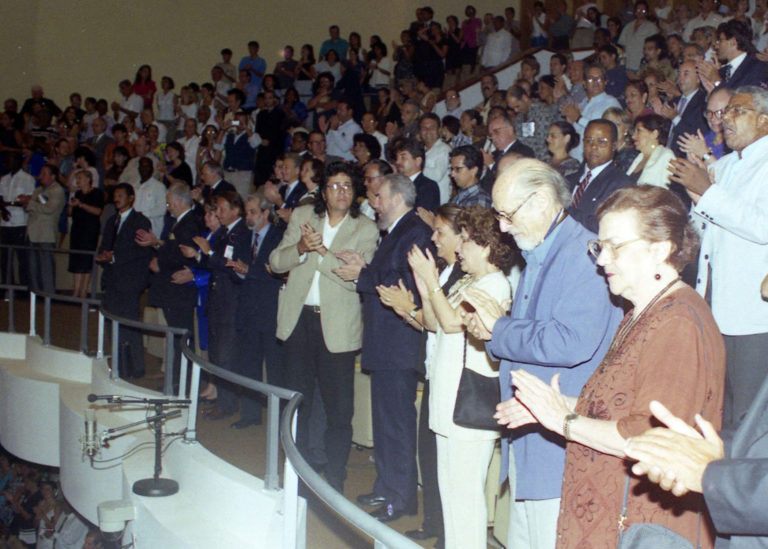 Fidel celebró su cumpleaños 63 junto a trabajadores de Contingente Blas Roca Calderío en el recinto ferial Expocuba, inaugurado el 4 de enero de ese año. Foto: Centro de Documentación/ Periódico Trabajadores