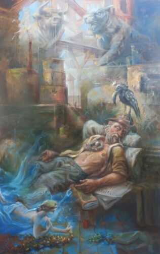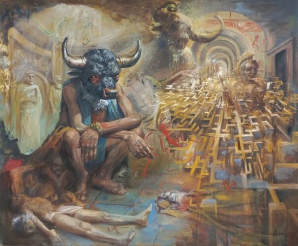 La muestra estará conformada por seis cuadros (óleos sobre lienzo) de grandes dimensiones y seis dibujos (tinta sobre papel), la mayoría de estos realizados a lo largo de este año. Según el artista, se trata de una idea surgida “a raíz de la lectura, o más bien del descubrimiento de la obra de Jorge Luis Borges, ese gran genio de la literatura argentina y universal. Descubrir en YouTube varias de sus conferencias y charlas sobre el infinito, el tiempo, el arte, hicieron que me lanzara a indagar sobre su vasto universo literario, videos, audiolibros, conferencias…