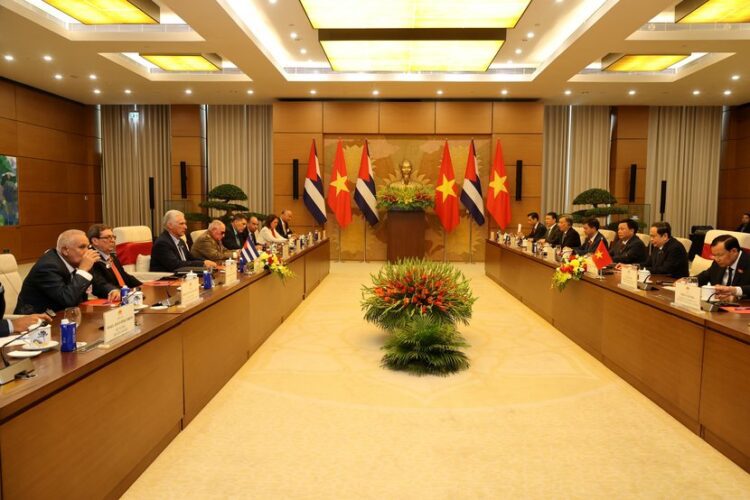 A media mañana de este lunes, Díaz-Canel también sostuvo un cálido encuentro con el compañero Tran Thanh Man, presidente de la Asamblea Nacional, «un amigo de Cuba de muchos años» —dijo—, al que agradeció «por toda su contribución personal al fortalecimiento de las relaciones bilaterales», antes como presidente del Frente de la Patria, y ahora como líder del parlamento vietnamita.