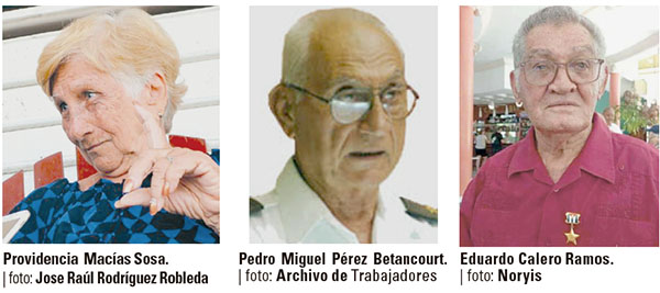 Lamentable pérdida para el movimiento sindical cubano constituye el reciente fallecimiento de tres de sus más abnegados hijos, quienes, por sus sobresalientes méritos laborales, humanos y de lealtad a la patria, recibieron en distintos momentos el Título Honorífico de Heroína y de Héroe del Trabajo de la República de Cuba. Fueron ellos Providencia Macías Sosa, el vicealmirante (R) Pedro Miguel Pérez Betancourt y Eduardo Calero Ramos.