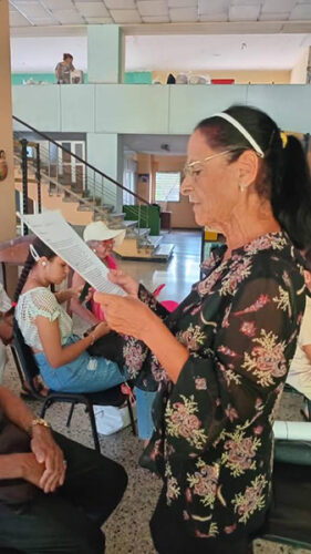 La poetisa Bertha María Gómez Sedano, presidenta de la referida Filial, condujo el encuentro y declamó junto a la poetisa Mercedes Mendiola el poema Elegía de los zapaticos blancos, del Indio Naborí, como recordación de su magistral obra y también como alusión a los miles de niños que están siendo masacrados por la infame agresión del gobierno de Israel al pueblo de Palestina.