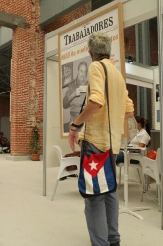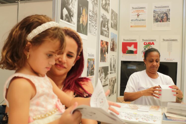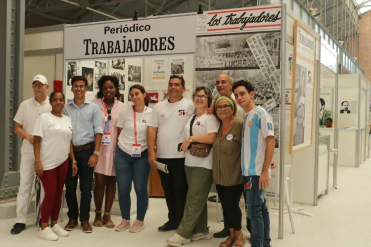 El stand del semanario exhibe libros, materiales promocionales, spots y propuestas gráficas que reflejan su compromiso con el periodismo cubano desde la mirada obrera y sindical.