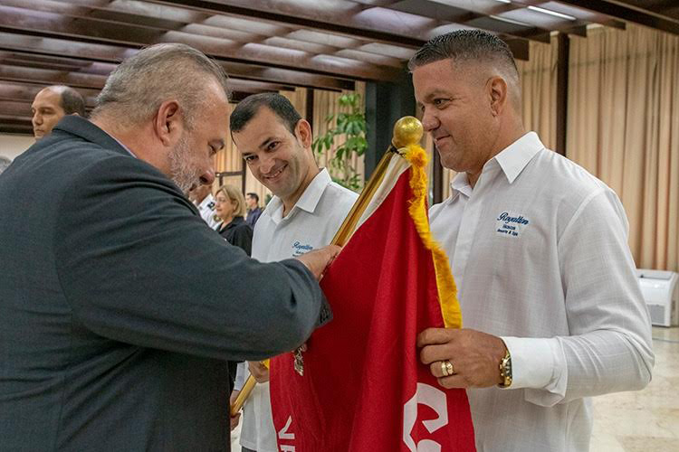 Entrega de la Orden Lázaro Peña de Segundo Grado al Royalton, recibida por Amaurys, primero de derecha a izquierda, y por el subdirector general de la instalación. Foto: Archivo