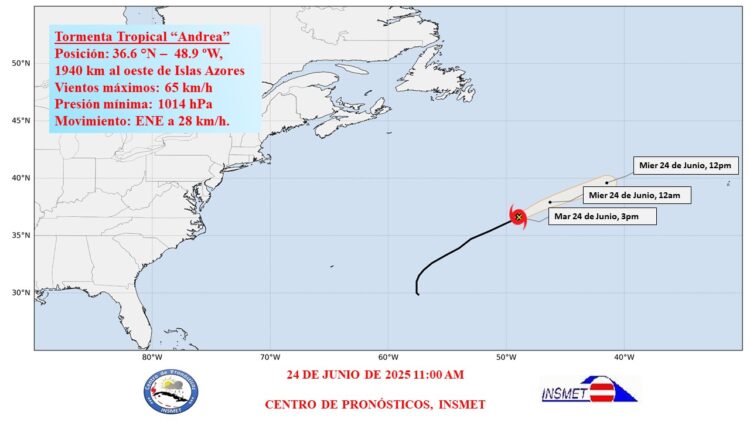 Melissa continúa con vientos máximos sostenidos de 85 kilómetros por hora, con rachas superiores y una presión central de 1003 hectoPascal. Actualmente se mueve con rumbo próximo al oeste, aunque ha aumentado ligeramente su velocidad de traslación a 24 kilómetros por hora.