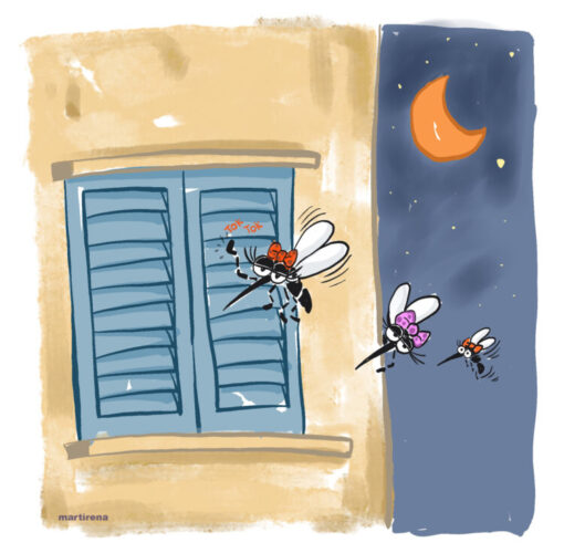 Según fuentes consultadas y experiencias propias, al anochecer los mosquitos (las hembras porque los machos prefieren los arbustos donde tienen su alimento) entran a las viviendas en busca de a quién picar.