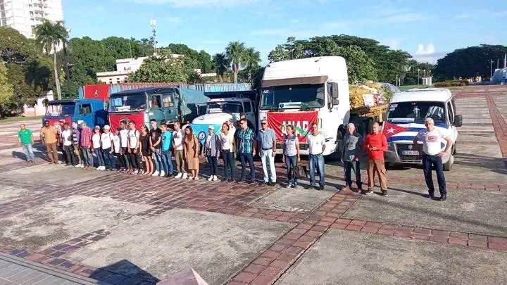 Desde la plaza de la Revolución Mayor General Ignacio Agramonte partió la comitiva cargada de alimentos no perecederos, carbón vegetal, alrededor de 20 mil prendas de ropa y calzado, así como otros insumos de cocina, libros, medicamentos, elementos para la construcción de viviendas y medicamentos.