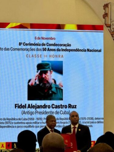 El embajador de nuestro país en Angola recibió las condecoraciones de manos del mandatario angolano, en medio de la ovación de los asistentes puestos de pie, en una clara expresión de reconocimiento, admiración y respeto hacia la figura de Fidel, cuyo legado tiene profundas raíces en este pueblo hermano con decenas de miles de historias de vidas beneficiadas por la acción del pueblo cubano bajo la guía del Comandante en Jefe.
