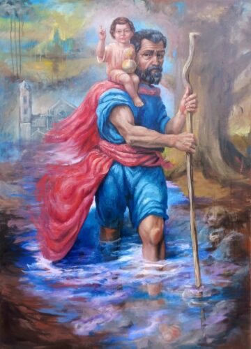 Inspirado en la historia de San Cristóbal, el artista de formación prácticamente autodidacta vuelve a hacer derroche de sus calidades expresivas en el dibujo y en el uso de una amplia y rica paleta de colores fríos y cálidos, así como de las transparencias, las luces y las sombras, en una suerte de entretejido en el que se fusionan la técnica con sus sensaciones personales.