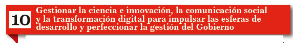 – Mantener el reordenamiento de las entidades de ciencia e innovación, con énfasis en las vinculadas a la producción y los servicios, para un mejor uso del conocimiento científico y tecnológico en función de solucionar los principales problemas económicos, sociales y ambientales.