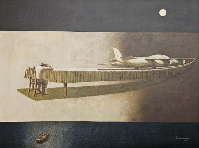 La obra Mi mesa, un drama y el Cosmos (2025), con unas dimensiones de 152 x 205 cm, puede ser vista como un verdadero estudio de las interacciones humanas a través de un objeto cotidiano: la mesa. Este elemento, que tradicionalmente simboliza la convivencia y la comunicación, aquí se transforma en un escenario donde se representan las tensiones familiares y sociales. La disposición de un avión sobre la mesa, junto con el uso audaz del color y las sombras, invita al espectador a reflexionar sobre las dinámicas de poder y vulnerabilidad que emergen de los actuales contextos doméstico y social.