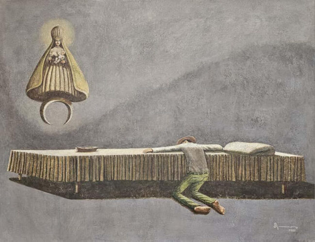 La figura central de la obra parece estar en un estado de introspección, capturando un momento de reflexión que se traduce en una forma del hombre recurrente en sus cuadros desde el surgimiento de su serie Los ritos del silencio (2001), quien parece suplicar ante la imagen de la Virgen de la Caridad del Cobre, Patrona de Cuba. Los detalles minuciosos en la representación de los brazos aseguran que el espectador sienta la intensidad de la emoción detrás de este acto. Bejarano utiliza simbolismos que invitan a una interpretación personal, resaltando la tensión entre lo que se espera y lo que realmente se siente en el ámbito familiar.