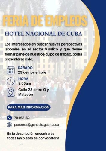 El Hotel Nacional de Cuba pone a disposición ofertas laborales para los interesados en buscar nuevas perspectivas en el sector turístico.