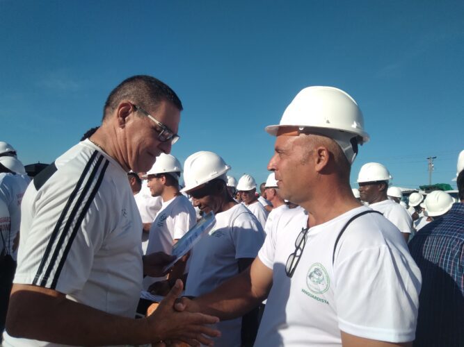 Yoelmis Osorio Perdeda, primer secretario del Partido en Mariel, Ana Teresa Igarza directora general de la Zona, Boris Luis Espinosa Pouyot, secretario de la CTC especial de la Zona, Alain Jesús González, director de la ECM, también reconocieron a entidades de la ZEDM con encadenamientos productivos necesarios para impulsar las obras en ejecución.