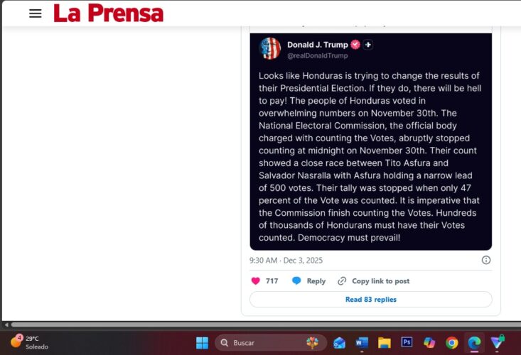 El gesto de Trump generó malestar incluso entre los republicanos, pues contradice la retórica antidrogas de Washington. En Honduras, en cambio, se interpretó como un espaldarazo a Asfura, quien milita en la misma agrupación política que Hernández (Partido Nacional).