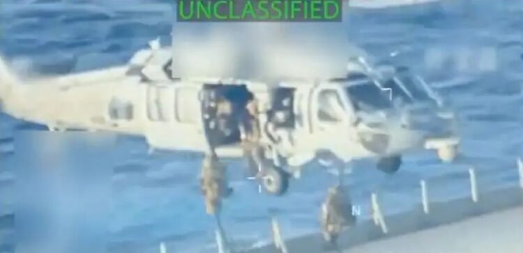 Un video difundido por funcionarios estadounidenses muestra helicópteros y equipos que abordaron el buque y tomaron el control sin resistencia de la tripulación. El audiovisual, que es una evidente prueba del delito, ha sido mostrado con presunción por quienes se creen dueños del mundo.