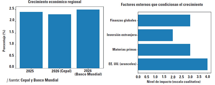 No obstante, la región latinoamericana llega al 2026 con un pronóstico de crecimien­to lento, una recuperación laboral tenue y una economía pendiente de factores externos, entre ellos la política proteccionista de Estados Uni­dos, los vaivenes de los precios de las materias primas y las condiciones financieras globales.