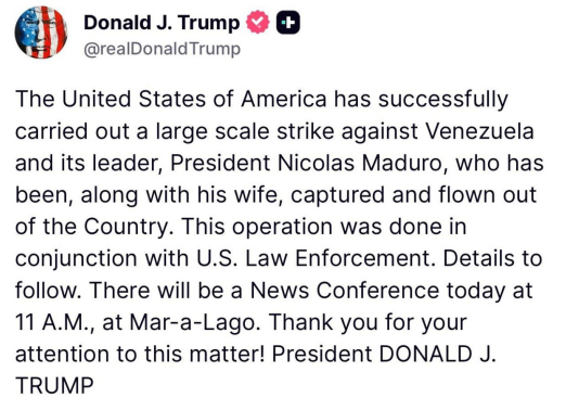 Trump confirmó un ataque a gran escala y aseguró que el presidente Maduro y Flores habían sido “capturados y salieron del país”.