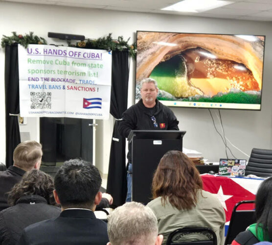Más de 65 personas que representaban a unos 15 sindicatos y organizaciones, asistieron a una importante reunión en el salón del Sindicato de Maquinistas para protestar contra la agresión estadounidense a Venezuela y las crecientes amenazas contra Cuba.