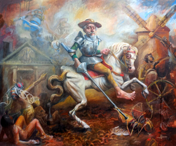 “Por ejemplo, en la pieza titulada La última frontera de la realidad (óleo sobre lienzo, 140x170cm), mientras la grey de los que nunca alabaron ni insultaron es perseguida por avispas. Don Quijote, personaje central de la novela Don Quijote de la Mancha, escrita por el español Miguel de Cervantes Saavedra, cabalga entre esos personajes reales o artificiosos posteriores a Dante, convencido de liderar una carga de caballería. Su condena es la ironía suprema: el hombre que más apasionadamente tomó partido por un ideal yace entre los pusilánimes. Su locura no es su castigo, sino su naturaleza; su verdadero sufrimiento es la incapacidad de los demás para reconocer su dignidad de caballero. En él se cuestiona la noción misma del pecado: ¿es peor la indiferencia cobarde que el compromiso delirante?”, asegura Enrique al referirse a esta obra ya terminada.