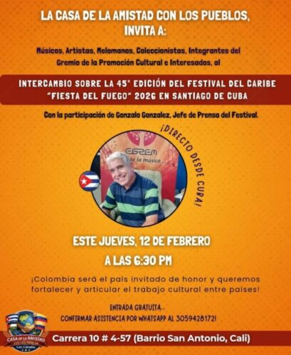 Para este jueves está pactado un intercambio acerca de la 45 edición de la Fiesta del Fuego, con la presencia de Gonzalo González, director de prensa de la Casa de Caribe, quien junto a Sadia Acosta, especialista principal de América Latina y el Caribe del Ministerio de Cultura de Cuba, y Madelis Sorio, especialista de relaciones internacionales del centro santiaguero, conforma la delegación cubana.