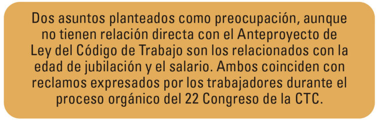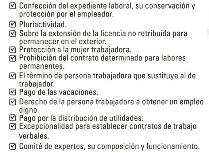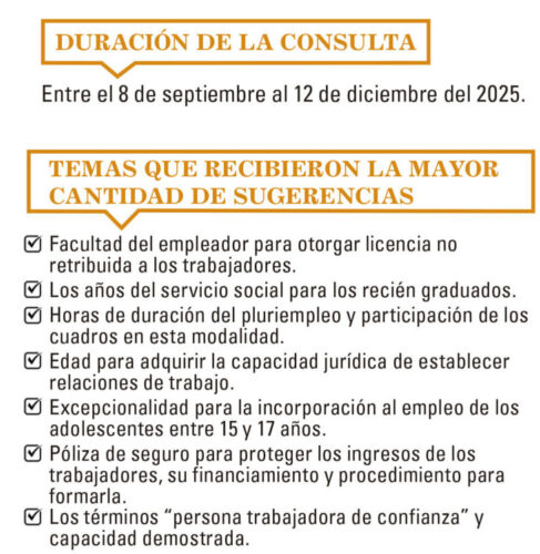 Funcionarios del Ministerio de Trabajo y Seguridad Social infor­maron que en estos momentos se analizan una a una cada sugeren­cia, y especificaron que aún no exis­te un consenso final sobre algunos criterios, entre ellos los relativos al pluriempleo, trabajador de con­fianza, persona trabajadora y otros, dado el diverso y alto número de propuestas.