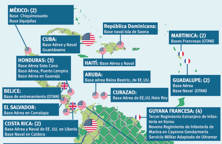 Sus bases militares han sido instaladas enmascarándolas en la supuesta lucha contra el terro­rismo, el narcotráfico y para hi­potéticas intervenciones humani­tarias por el efecto de fenómenos naturales. Hay que aclarar que Washington exige inmunidad de sus soldados a las naciones en las que están enclavadas.