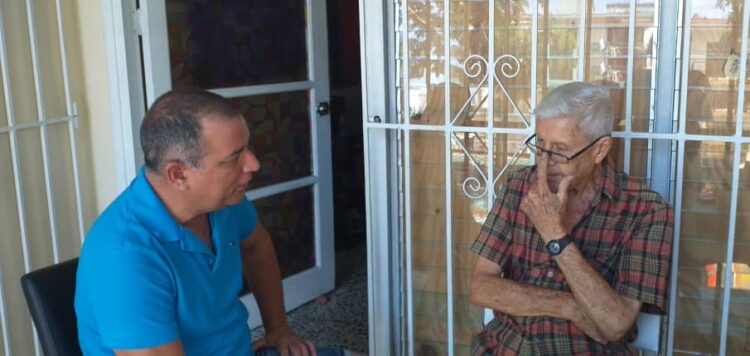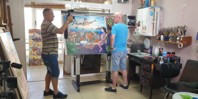 Juder Laffita durante una sesión de trabajo con el reconocido pintor Pedro de Oraá (La Habana, 23 de octubre de 1931-25 de agosto de 2020), Premio Nacional de Artes Plásticas 2015, quien además fue poeta, narrador, ensayista y crítico de artes plásticas.