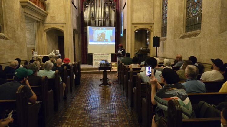 La reunión estuvo copresidida por Destiny Rivera, dirigente del Comité “Manos Fuera de Cuba” de Los Ángeles, y por Mwezi Odom, secretario nacional del African People’s Socialist Party. Desde el inicio, los asistentes corearon consignas contra el cerco económico y en defensa de la soberanía cubana.