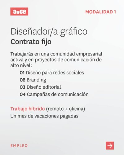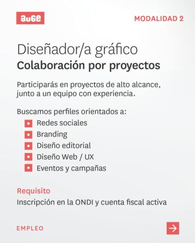 Si deseas formar parte de proyectos de alto impacto y llevar tu creatividad al máximo Auge te ofrece oportunidades para contrato fijo y colaboración por proyectos.