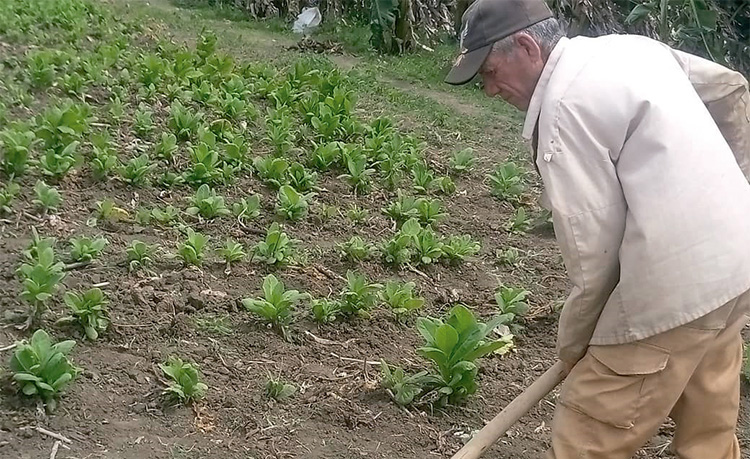 “Ojalá caiga a ver si la tierra afloja”, auguraba el jornalero sin interrumpir su paso de guataquear. “A esto me he dedicado todo el tiempo. Los años pesan, cumpliré 63, con experiencia y fuerzas para echar pa’lante”, suelta en ráfaga el espirituano sin apartar la vista del surco, donde repasa una capadura de tabaco (el brote que germina tras el primer corte).