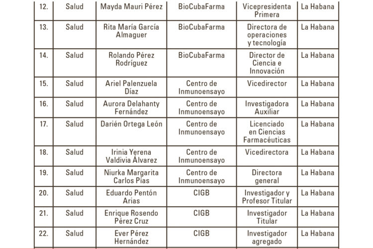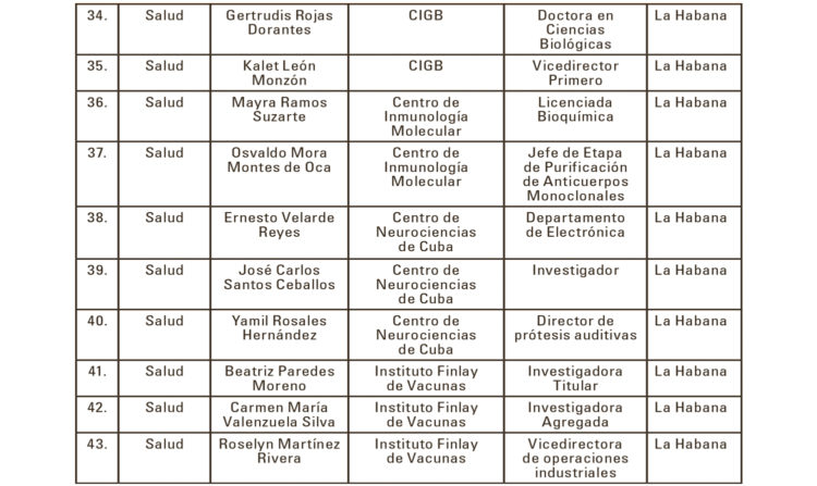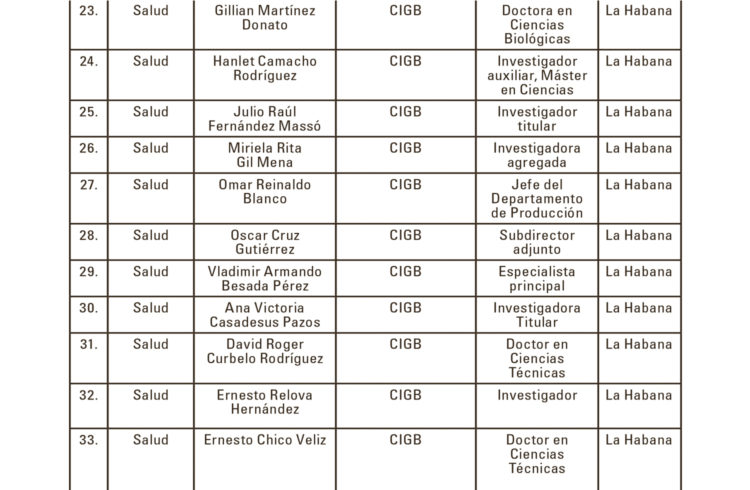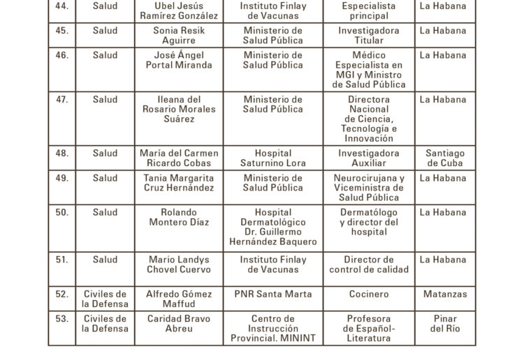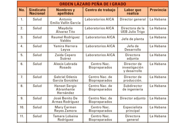 Raúl Casero, Irán Millán, María Elvira Dávila, Luis Paneque, Martha Zoe Lemus, Francisca Holder, Modesto Samón, Agustín Lage, Eduardo Martínez, Fernández Yero, Luis Herrera, Tania Crombet, Teresita de Jesús Montero, Rafael Venegas, Jorge Eduardo Berrio. Así se nombran los que recibieron de manos de Miguel Díaz-Canel Bermúdez el título que los acredita como Héroes y Heroínas del Trabajo de la República de Cuba.