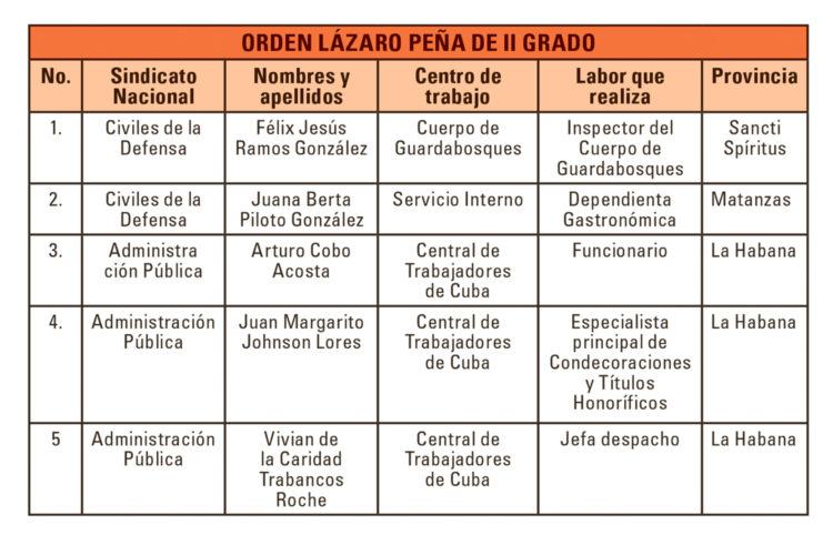 También a propuesta del Secretario General de la Central de Trabajadores de Cuba, el Presidente cubano, mediante decretos, otorgó la Orden Lázaro Peña de Primer Grado a 56 insignes trabajadores de diversas esferas y la de Segundo Grado a tres dirigentes sindicales y dos trabajadores civiles de la defensa.