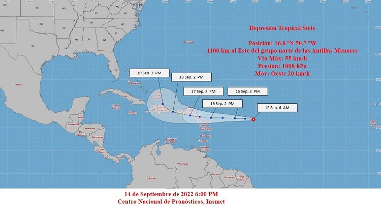 La depresión tropical siete continúa moviéndose en los mares al este del Arco de las Antillas Menores mostrando mejor organización en sus áreas de chubascos y lluvias, aunque mantiene vientos máximos sostenidos de 55 kilómetros por hora, con rachas superiores. Su presión central descendió hasta 1008 hectoPascal.