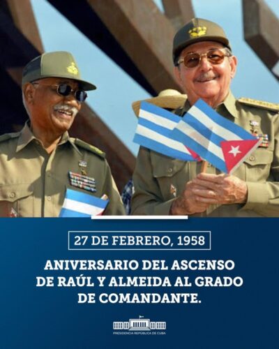 En su mensaje Díaz-Canel rememoró que el 27 de febrero de 1958 el Comandante en Jefe Fidel Castro firmó dos órdenes en las que ascendía de capitanes a comandantes del Ejército Rebelde a Raúl y Almeida, con la orden de dirigir las nuevas columnas guerrilleras seis y tres, respectivamente.