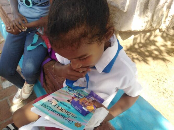 En esta jornada del abanico cultural más importante del Municipio Especial encontré a Lien Isabel Ramírez James, pionera de primer grado de la primaria Josue País García, quien junto a su mamá Leidis y abuela Maura andaban recorriendo las áreas expositivas, donde compraron el libro infantil: Un paseo con Luna en bicicleta, del escritor Maykel Rafael Paneque.