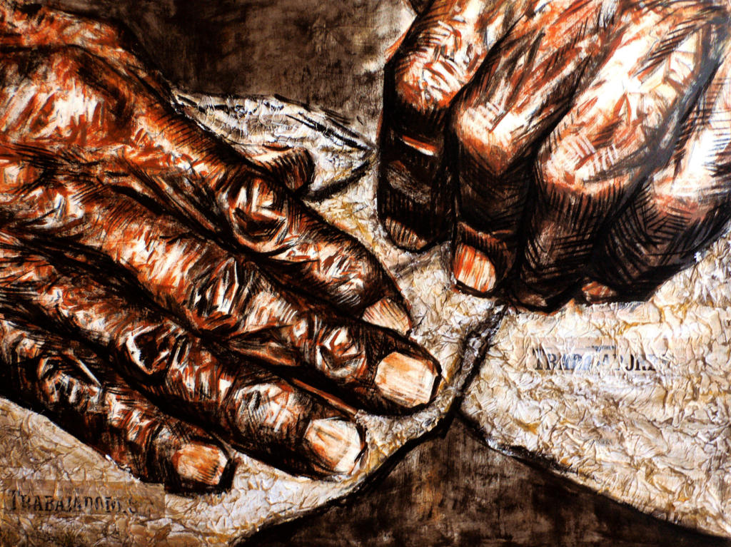 Bajo tales premisas estéticas, Francis Coppola (La Habana, 1978) ha concebido, especialmente para rememorar los 90 años del histórico Palacio de los Torcedores, una muestra de pinturas y dibujos que, parafraseando aquellas líneas, ha titulado Amor que aquilata el alma…, conjunto de trabajos —óleos sobre lienzo; acrílicos, temperas, grafiti y plumillas sobre cartulina—; en los que este creador graduado de la Escuela de Artes San Alejandro (2004) no solamente nos ofrece su visión lírica sobre el legendario universo de la industria del tabaco, desde su cultivo y cosecha hasta la emblemática labor de los torcedores, entre cuyas manos se amasa uno de los productos más alegóricos de nuestro país, estrechamente vinculado con las luchas de emancipación del proletariado cubano.