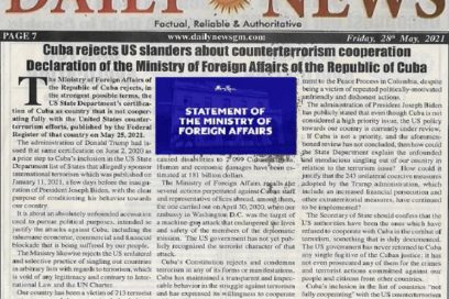 Bajo el título Cuba rechaza calumnias de EE.UU. sobre cooperación contra el terrorismo, el diario gambiano Daily News publica íntegramente una Declaración del Ministerio de Relaciones Exteriores de la mayor de las Antillas contra otra nueva agresión de Washington Continuar leyendo