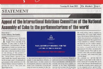 El influyente diario gambiano The Standard publica hoy íntegramente un Llamamiento de la Asamblea Nacional del Poder Popular (ANPP) de Cuba que exhorta a todos los parlamentarios del mundo a sumarse al rechazo global contra el bloqueo de EE.UU. a la isla caribeña. Continuar leyendo